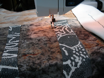For the first time in my life I am collaborating with a group of artists. The work will be exhibited as part of Innovations (see the sidebar). We shared materials from our studios in a swap meet about a month ago. I brought home an unusual combination of things, chosen simply because I was attracted to them. Here you can see I'm stitching down some block printed seersucker fabric (originally a skirt) created at SKIF International by my former student Nina Ganci. The silk I'm using was shibori rusted last year.